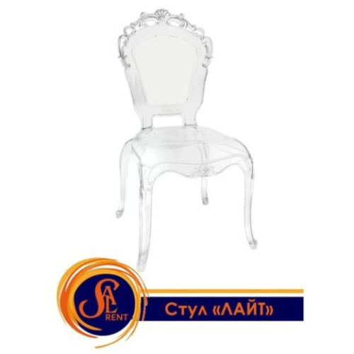 Прозорий стілець в оренду «Лайт», виготовлений з міцного пластику, він має форму декоровану та витончену. Так виглядали стільці часів бароко. Це епоха величі та грації, багатства та розкоші. Перебравши на себе стиль барок і додавши прозорість сучасності, ми отримали варіант гарного стільця для банкету. Він виглядає просто, але його декоративне рішення підкреслює не побутовий стиль.